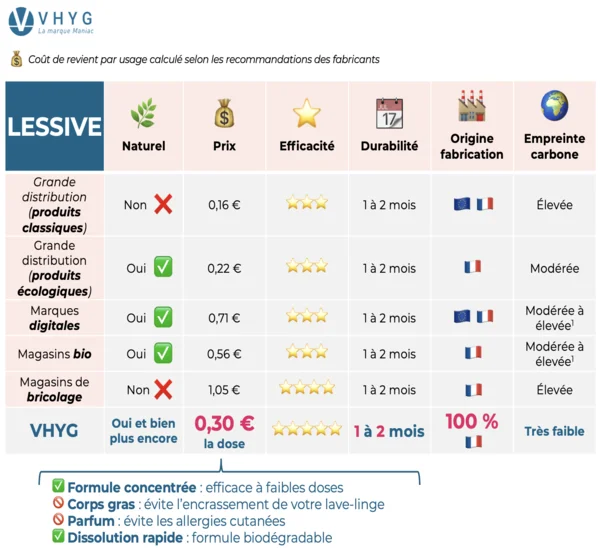 Voici une comparaison détaillée entre VHYG et les produits de trois grandes catégories : grande distribution (prêts à l’emploi), marques digitales, et grandes surfaces de bricolage (GSB).